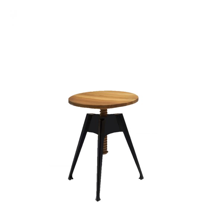Sgabello con altezza regolabile. Struttura in massello di faggio tinto nero, sedile e vite di regolazione dell'altezza della seduta in massello di rovere. Uso solo interno.