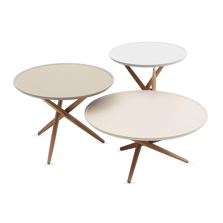 Tavolino versatile con un incrocio elegante di gambe in legno massello di rovere, rivere tinto grigio o noce canaletto ed un piano di forma rotonda touch (laccato). Possibilità dio personalizzare i piani. Prezzo indicativo a partire da.