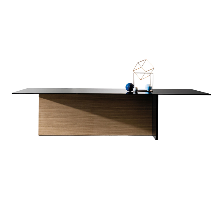 Tavolo con top disponibile in vetro extrachiaro trasparente o stratificato fumé o bronzo. Base composta da un elemento in legno, varie finiture, e un elemento in vetro stratificato laccato nero. Prezzo di partenza.