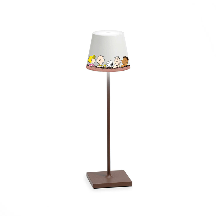 Nel soggetto “Together” sono rappresentati tutti i Peanuts, stampati attorno alla testa della lampada come affacciati a un muretto; anche questo modello è bicolore: testa bianca, asta e base color corten.