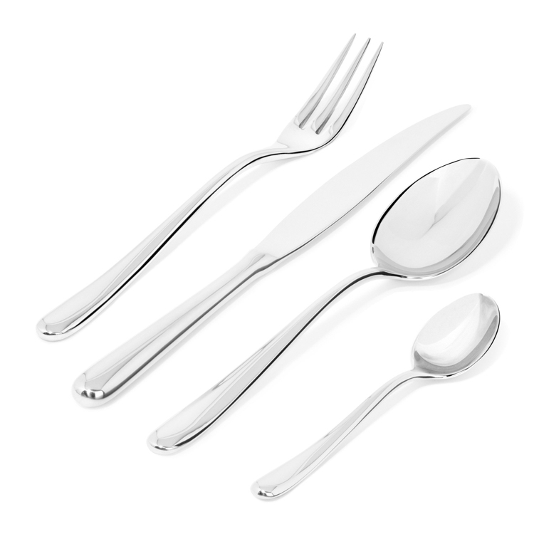 Servizio di posate composto da sei cucchiai da tavola, sei forchette da tavola, sei coltelli da tavola monoblocco, sei cucchiaini da tè in acciaio inossidabile 18/10 lucido.