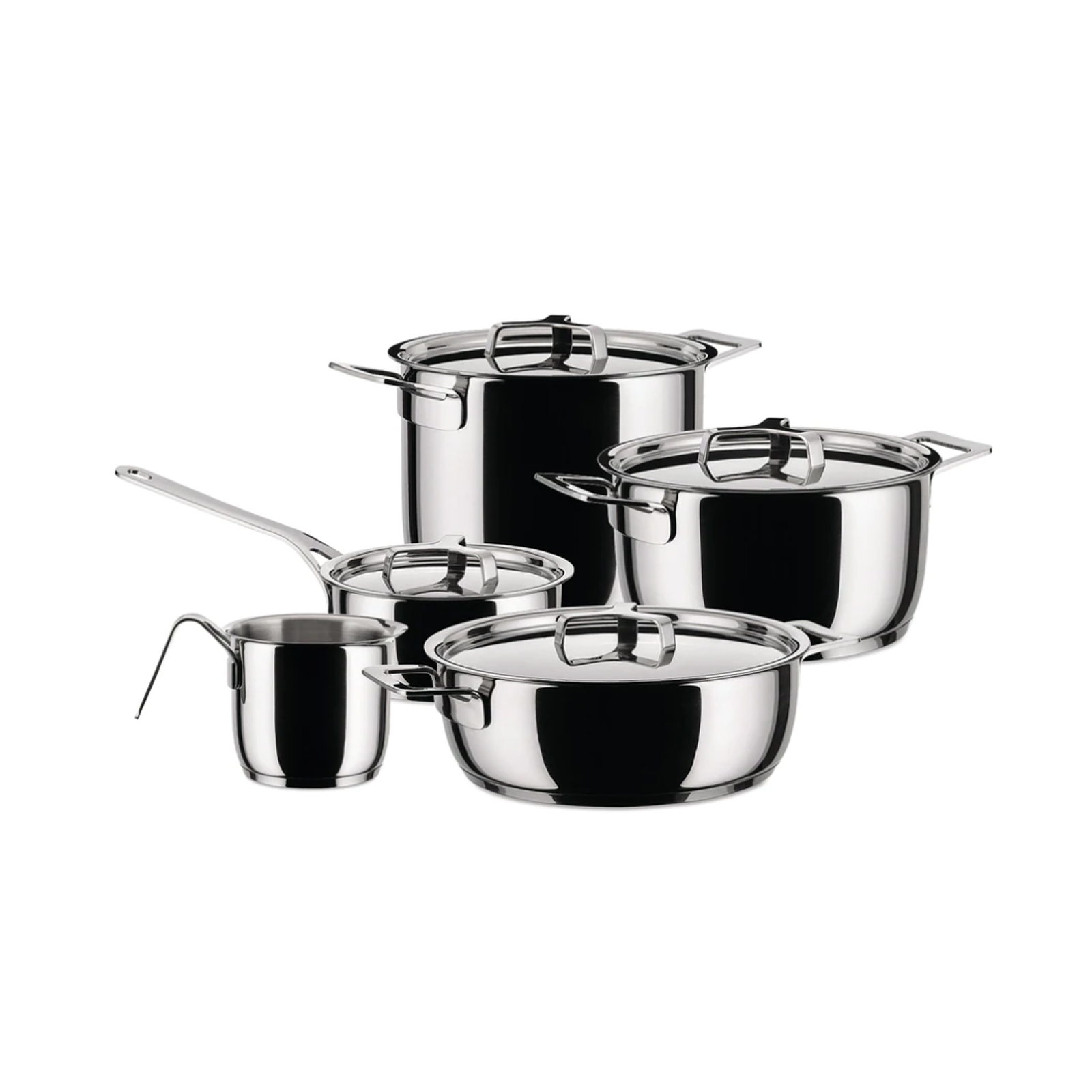 1 Pentola, 2 Casseruole a due manici, 1 Casseruola a manico lungo, 1 Bollilatte, 3 Coperchi. Tutte con fondo in acciaio magnetico adatto anche alla cottura a induzione.