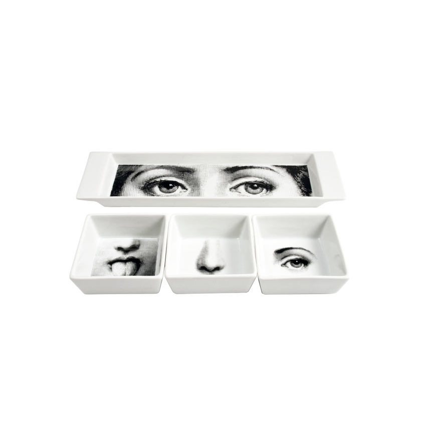 Il gusto di Fornasetti per la decorazione della tavola si ritrova nell'antipastiera I sensi. Gli elementi che compongono il set, realizzati in porcellana decorata a mano e impreziositi dai tratti di Lina Cavalieri, sono ideali per dare un tocco di irriverente ironia alla tua mise en place.
