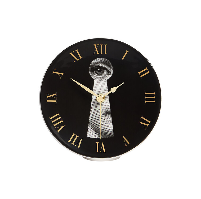 L'orologio da tavolo Fornasetti si aggiunge alla collezione dei complementi per la casa per arricchire scrivanie, librerie, comodini con un accessorio fuori dall'ordinario.