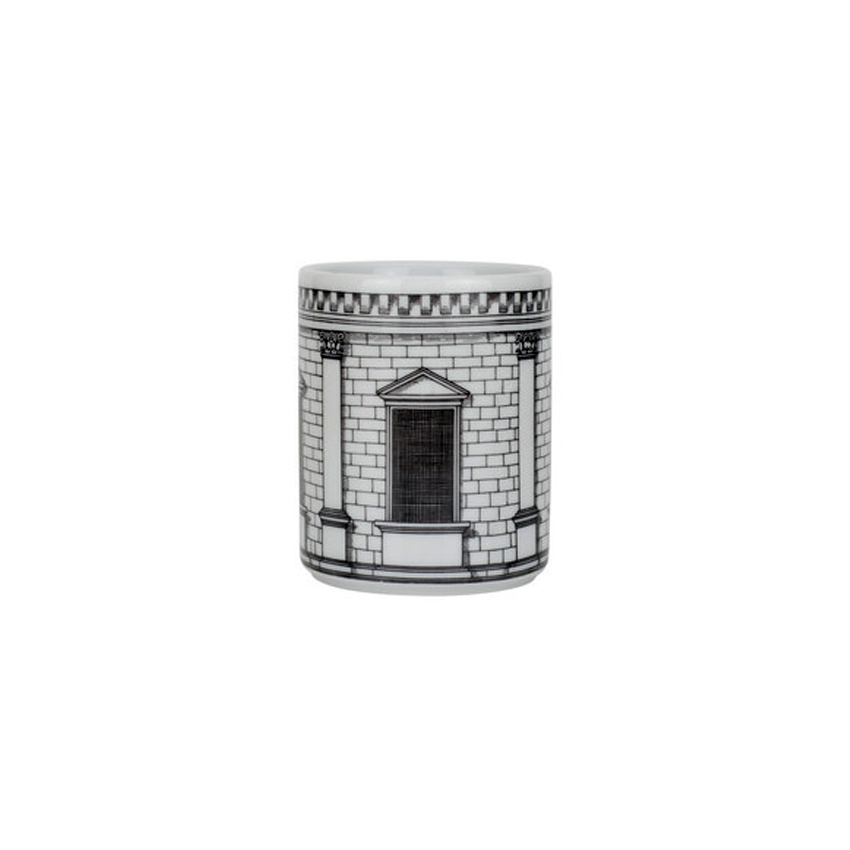 Il motivo decorativo architettonico riveste questo portamatite in porcellana decorata a mano, trasferendo l'immaginario fornasettiano su un oggetto quotidiano che diventa così un pezzo da collezione.