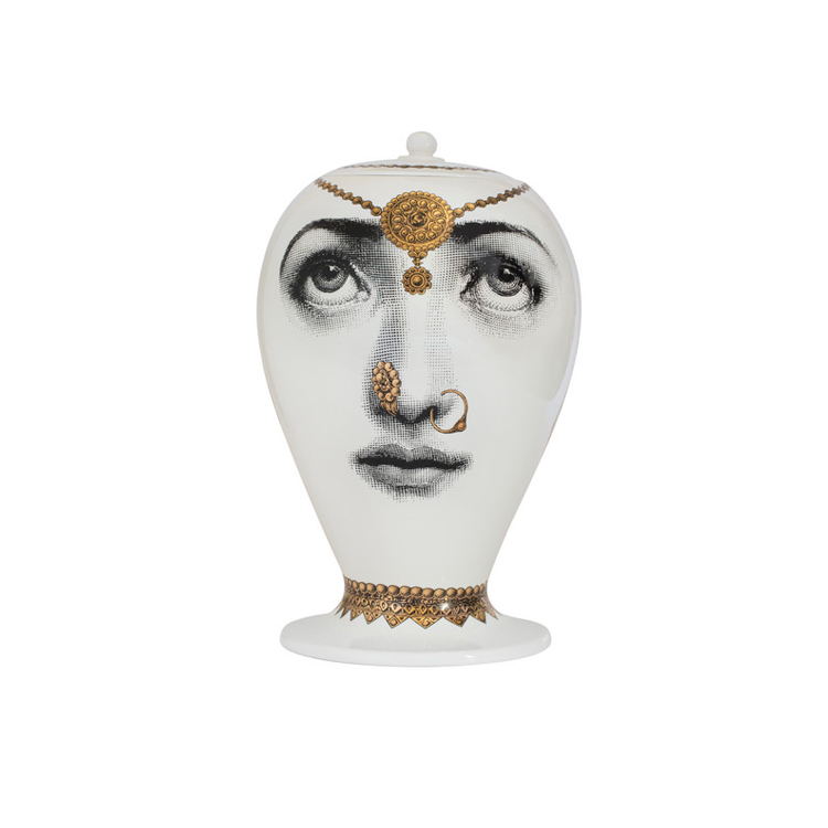 Gli iconici lineamenti di Lina Cavalieri, giocosamente reinterpretati da Fornasetti, sono l'ispirazione della serie Tema e Variazioni, di cui questo vaso in ceramica decorato a mano con inserti in oro fa parte: un vero pezzo da collezione.