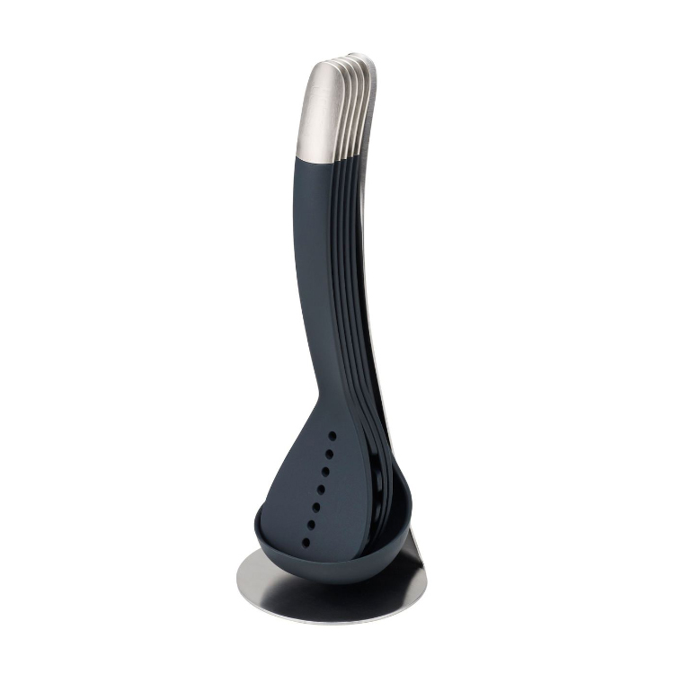 Questo intelligente set di utensili comprende cinque essenziali utensili da cucina con un elegante supporto di stoccaggio in acciaio inossidabile.