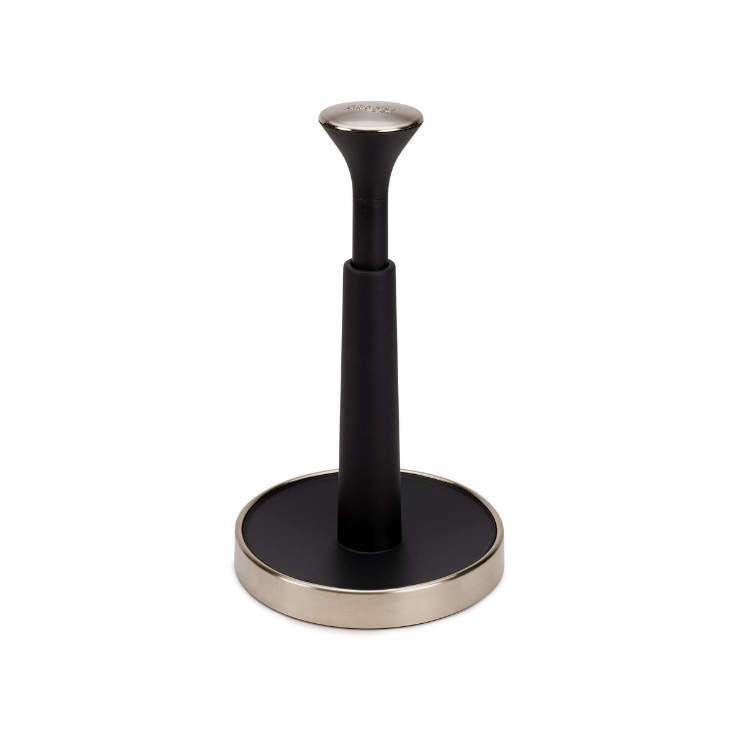 Questo portarotolo da cucina intelligente è dotato di un tappo superiore molleggiato che può essere spinto verso il basso per bloccare il rotolo per facilitare lo strappo.