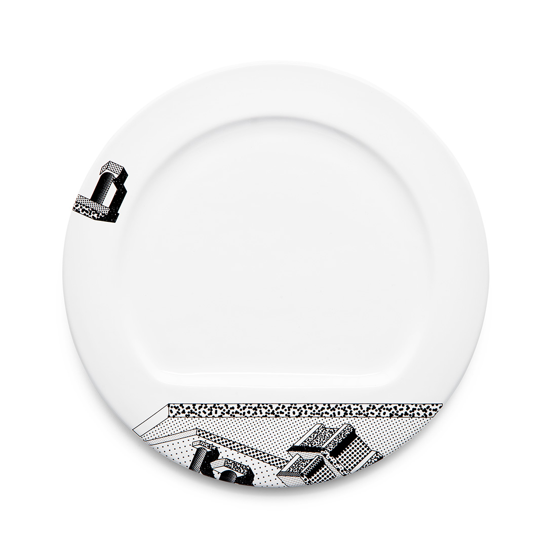 La serie di piatti Indivia e Lettuce, e Rucola disegnata da Sottsass – tutti bianchi con decorazione grafica realizzata in nero che rappresentano porzioni di disegni architettonici per i primi due o piccole macchie puntiformi in Rucola - gioca in maniera surreale con i nomi di vegetali che sembrano non corrispondere né per colore né per figurazione a quanto vediamo. Forse l’allusione è a quello che si mangerà nel piatto? Oppure il gioco sta nel rimando: la verdura è un contorno!