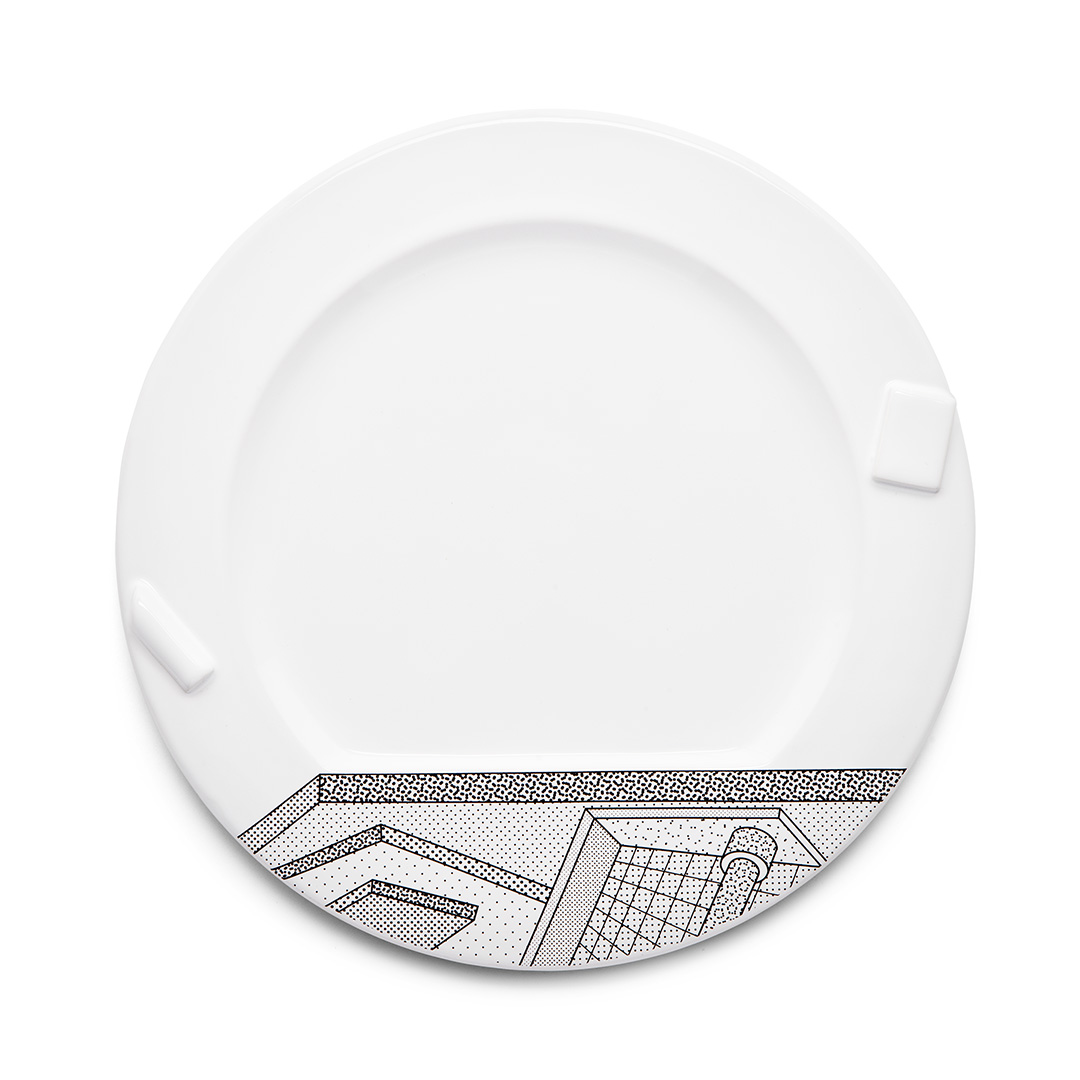 La serie di piatti Indivia e Lettuce, e Rucola disegnata da Sottsass nel 1985 – tutti bianchi con decorazione grafica realizzata in nero che rappresentano porzioni di disegni architettonici per i primi due o piccole macchie puntiformi in Rucola - gioca in maniera surreale con i nomi di vegetali che sembrano non corrispondere né per colore né per figurazione a quanto vediamo. Forse l’allusione è a quello che si mangerà nel piatto? Oppure il gioco sta nel rimando: la verdura è un contorno!