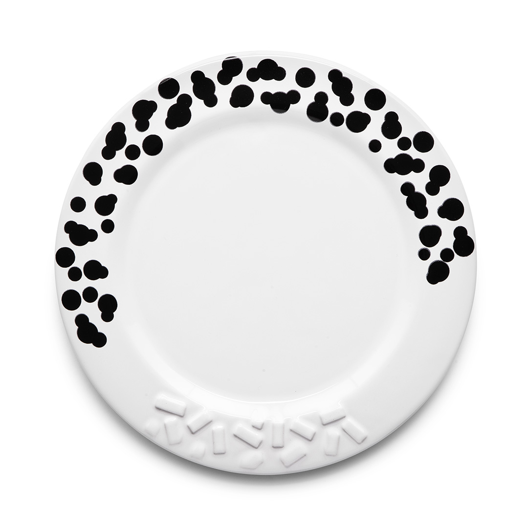 La serie di piatti Indivia e Lettuce, e Rucola disegnata da Sottsass – tutti bianchi con decorazione grafica realizzata in nero che rappresentano porzioni di disegni architettonici per i primi due o piccole macchie puntiformi in Rucola - gioca in maniera surreale con i nomi di vegetali che sembrano non corrispondere né per colore né per figurazione a quanto vediamo. Forse l’allusione è a quello che si mangerà nel piatto? Oppure il gioco sta nel rimando: la verdura è un contorno!