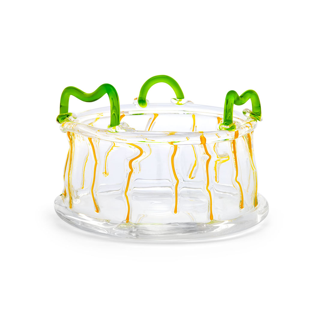 Vaso decorativo in vetro di Murano lavorato a mano con le tradizionali tecniche di soffiatura a bocca libera e a stampo.