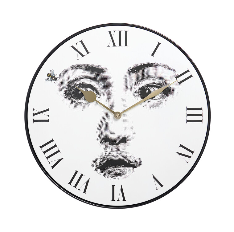 Questo orologio da parete Fornasetti combina eleganza e spirito ironico grazie all'inconfondibile volto della serie Tema e Variazioni che qui appare sorpreso dalla presenza di una piccola ape.