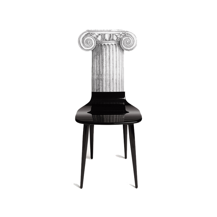 Decorata a mano e dotata di gambe in legno massello, la sedia è un archetipo dell’arredamento e del design che non poteva mancare nel repertorio fornasettiano. Questo decoro trompe l'oeil è ispirato all'arte classica e porta negli ambienti un suggestivo gioco senza tempo.