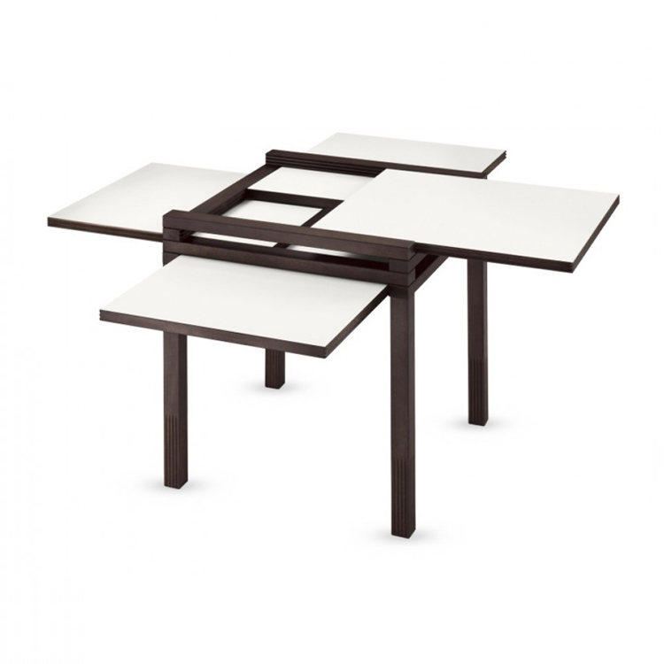 Tavolo con struttura in legno massello, allungabile con il semplice movimento delle gambe e del piano. Il piano è con entrambi i lati in tranciato (legno) e suddiviso in tre parti mobili. Il piano è anche disponibile in finitura exclusive (polaris) su entrambi i lati, con il bordo in legno che riprende la finitura in massello della struttura.