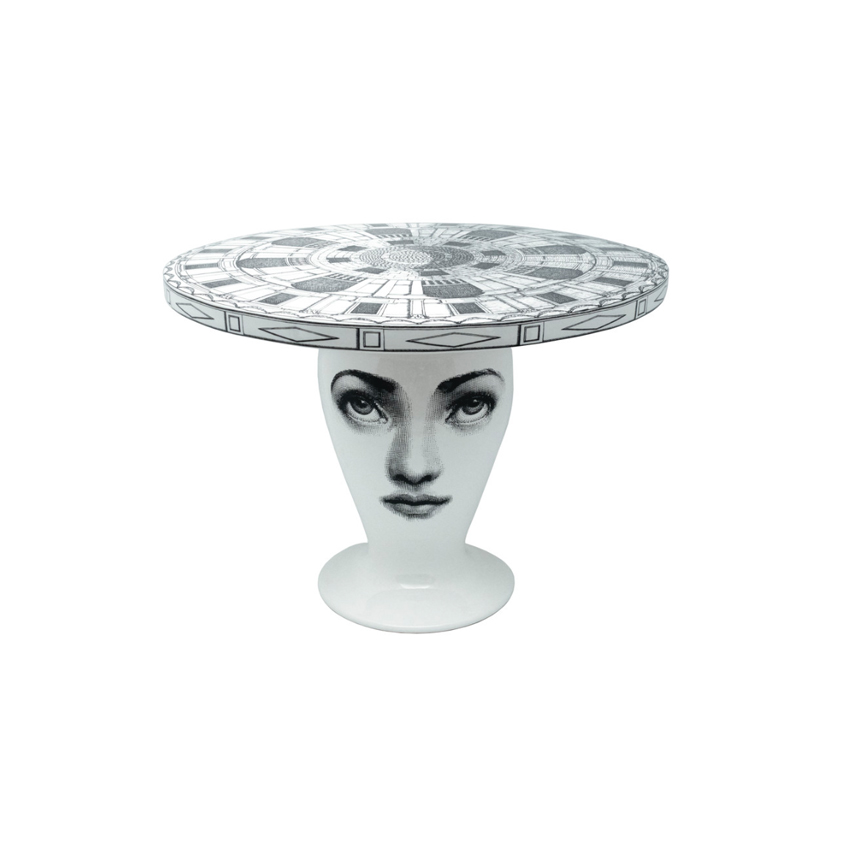 The Architettonico table is born from the combination of two iconic Fornasetti motifs: the taste for the daring perspective games of trompe l'oeil architecture with the face of the opera singer Lina Cavalieri represented on the base, which in turn recalls the unmistakable shape of Fornasetti vases.