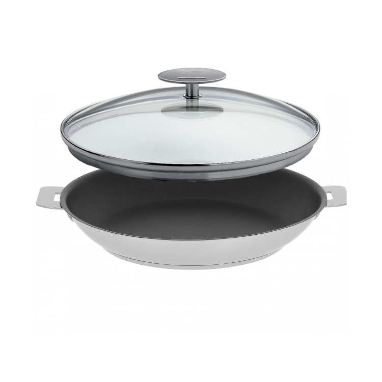 18/10 stainless steel frying pan diam. 30 cm. with removable handle, brushed finish, with Exceliss non-stick coating. Removable Strate Collection.