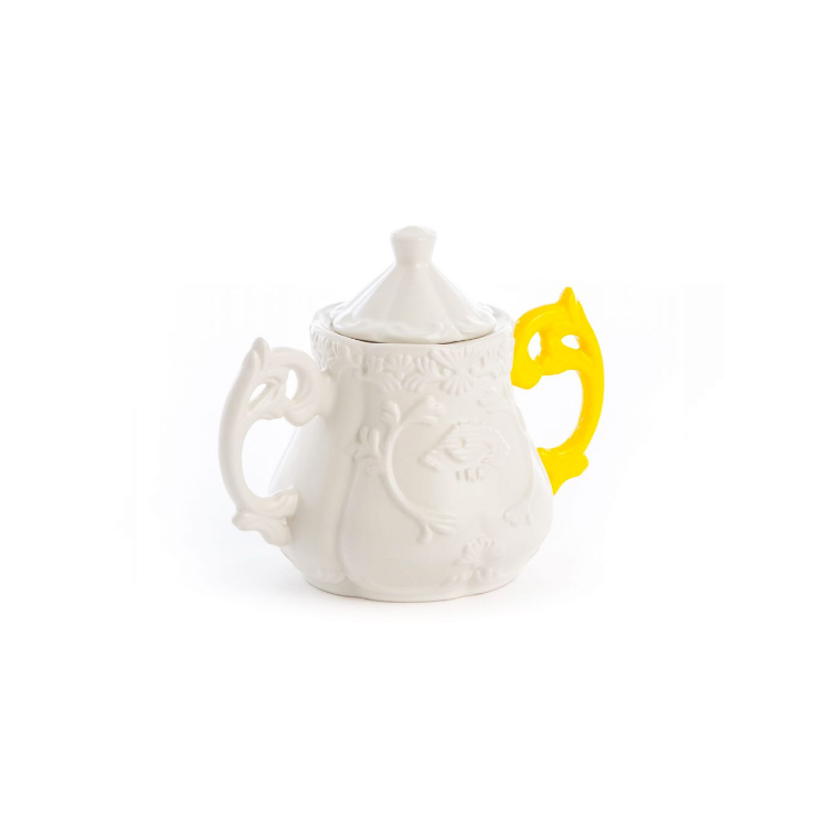 Mugs, tea and coffee sets with a baroque inspiration. Fine opaque porcelain with mat white finishing and fluorescent coloured handles. Brilliant and elegant, the new gold glossy finishing gives to the collection a new sophisticated way of living.